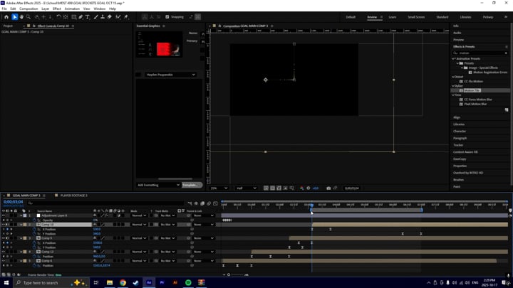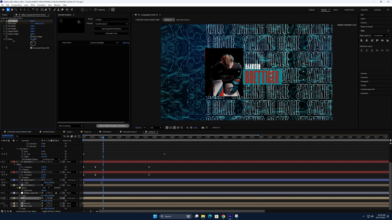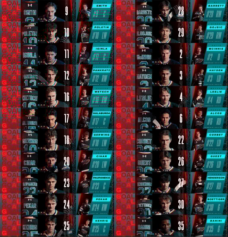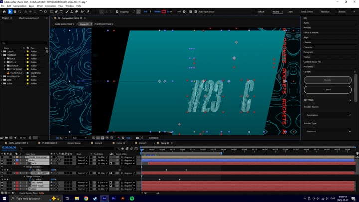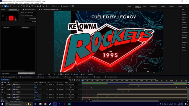 Behind the scenes footage of the After Effects template created for the Player Goal animation. JavaScript expressions connected to Essential Graphics panel, text layers and compositions with footage make switching between players and rendering easy and effecient. This technique was used for the majority of the other deliverables, including Player ID, Starting Goalie, and Match Up.